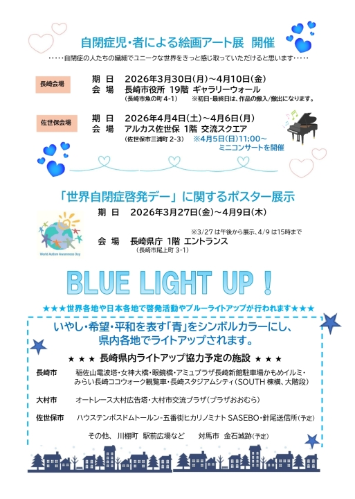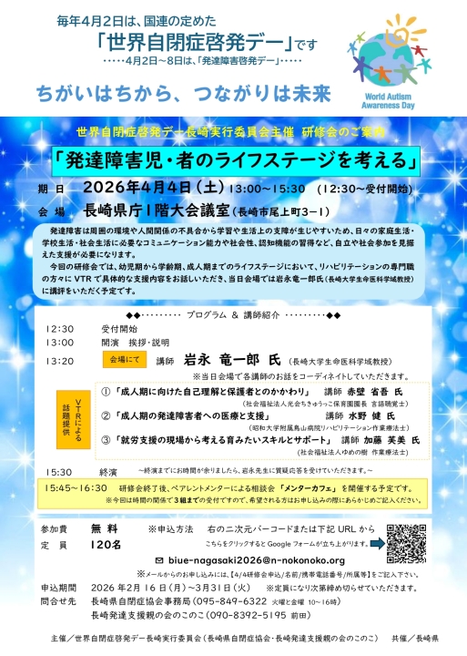 - 「世界自閉症啓発デー2026 in 長崎イベントの案内」をアップしました。
